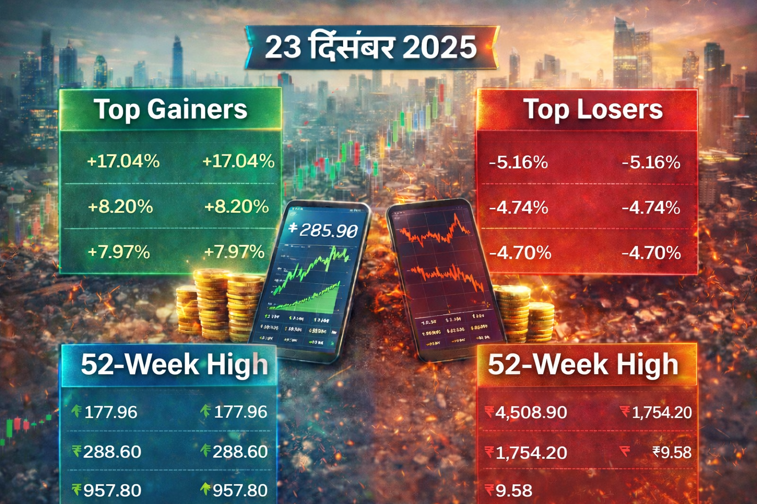 23-12-2025 के शेयर बाजार में उतार-चढ़ाव के बीच कई शेयरों में जबरदस्त तेजी देखने को मिली, तो कुछ स्टॉक्स पर बिकवाली का दबाव भी साफ नजर आया। आज के कारोबारी सत्र में निवेशकों की नजर खास तौर पर उन शेयरों पर रही जो टॉप गेनर्स, टॉप लूजर्स, 52-वीक हाई और 52-वीक लो की लिस्ट में शामिल रहे। आज के इस आर्टिकल में हम आसान भाषा में जानेंगे कि आज बाजार में किन-किन शेयरों ने शानदार प्रदर्शन किया और किन शेयरों में कमजोरी देखने को मिली।